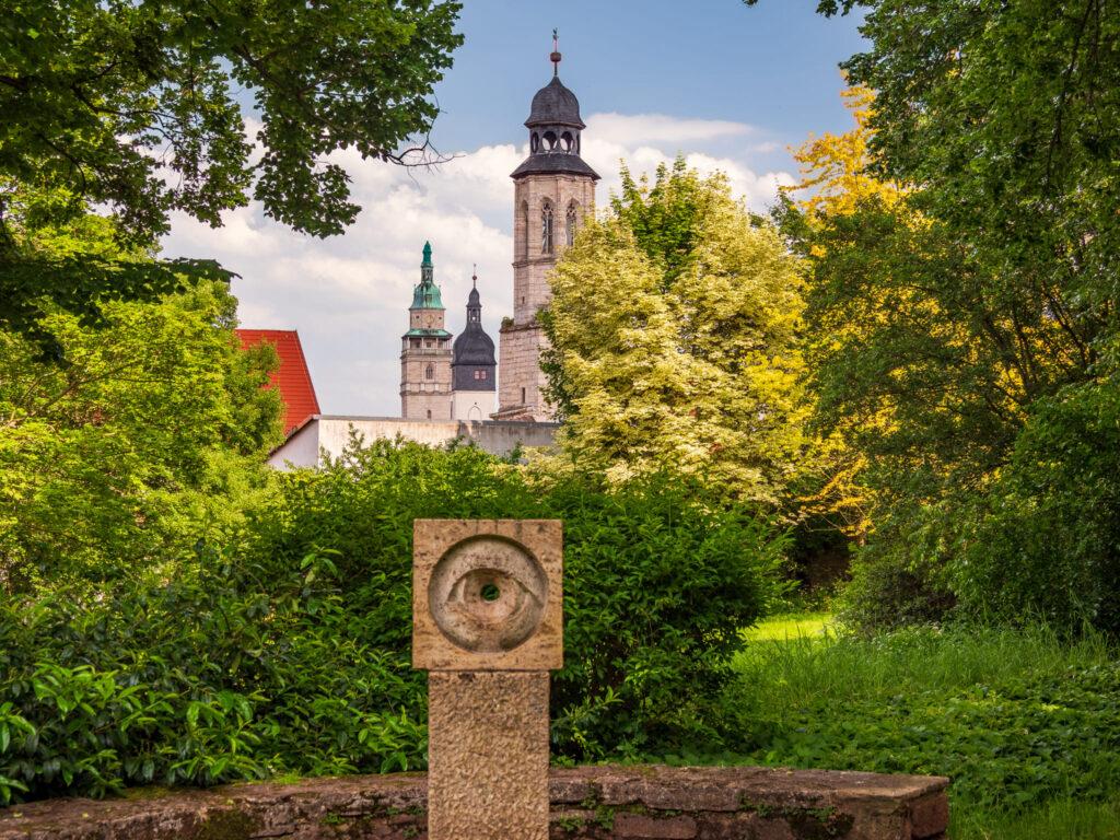 Guck mal durch! Ein beliebter Fotospot ist der „Drei Türme Blick“. Vor der Gottesackerkirche ist der „Argusblick“, ein aus Stein gehauenes Auge in einer Travertinsäule aufgestellt. Schaut man durch das Guckloch, sieht man die drei Türme der Augustinerklosterkirche, den Hausmannsturm des Rathauses und den Kirchturm der Marktkirche auf einem Blick.