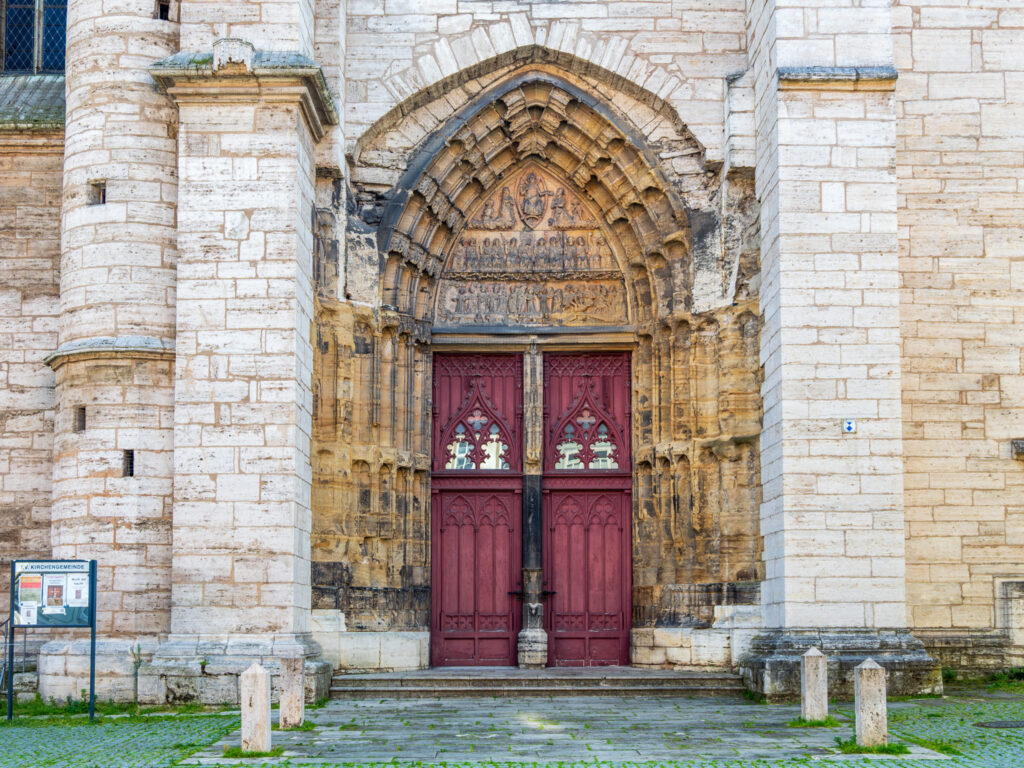 Verirren nicht möglich Verirren kannst du dich in Bad Langensalza eigentlich nicht, denn für Orientierung sorgt der Kirchturm der St. Bonifacii Marktkirche. Du kannst aus fast jeder Ecke der Stadt einen Blick auf ihn erhaschen. Der Turm mit Renaissanceobergeschoss und Einzeigeruhr ist mit einer Höhe von 72,49 Meter der zweithöchste Thüringens und überragt die gesamte Stadt. Es lohnt sich auch die Kirche von innen zu besichtigen. Ich mache das immer gerne, setzte mich kurz um etwas auszuruhen und lasse die Kirche, bevor es auf meinem Stadtspaziergang weitergeht, auf mich wirken. Es brauchte 320 Jahre, bis der Bau der spätgotischen, dreischiffigen Hallenkirche in unterschiedlichen Bauphasen 1592 beendet war. Eigentlich war der Bau von zwei Türmen geplant, jedoch gingen die Gelder aufgrund des Rückgangs des Waidhandels aus. Beeindruckend ist auch das spitzbogige Westportal, welches das Gottesgericht zeigt. Als Baumaterial wurde auch hier wieder der heimische Travertin verwendet.