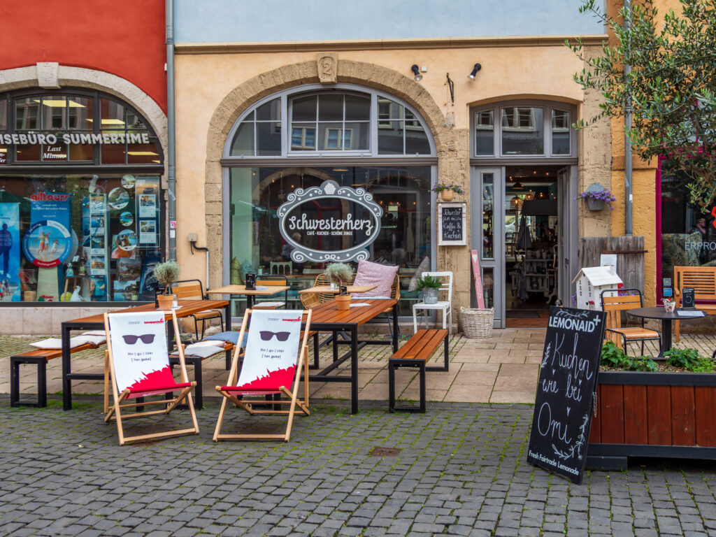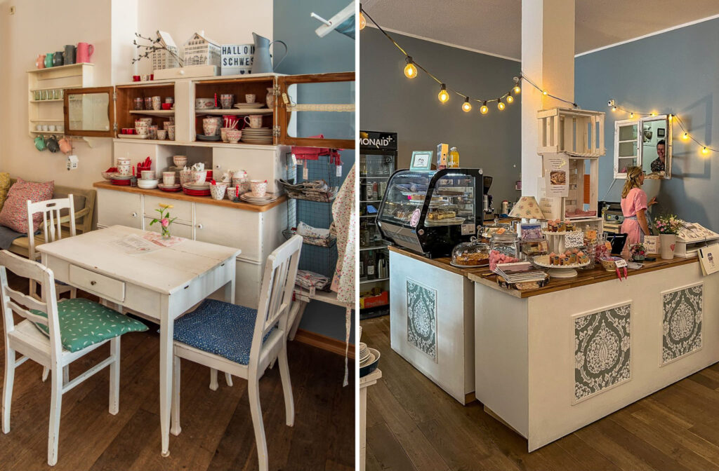 Mit viel Liebe zum Detail Café, Kuchen und schöne Dinge bieten Ulrike & Anne-Kathrin Walter in ihrem Café Schwesterherz an, Passanten gaben mir den Tip hier Kuchen zu essen. Das Café befindet sich in der Fußgängerzone und wenn du das Besondere liebst, bist du hier genau richtig, du wirst dich sehr wohl fühlen. Die herzlichen Schwestern haben sich ihren Traum verwirklicht und führen nun schon seit 12 Jahren sehr erfolgreich ihr eigenes Café, das noch mehr als feine Kuchen und Torten anbietet. Vintage Kommoden und Küchenschränke sind mit hübschen Kleinigkeiten, Tischwaren, Dekorationen und Leckereien zum selbst verwöhnen oder zum verschenken gefüllt. Es gibt viele schöne Dinge zu entdecken, ein tolles Konzept, in dem sich jedes Mädchen jeden Alters wohlfühlt.