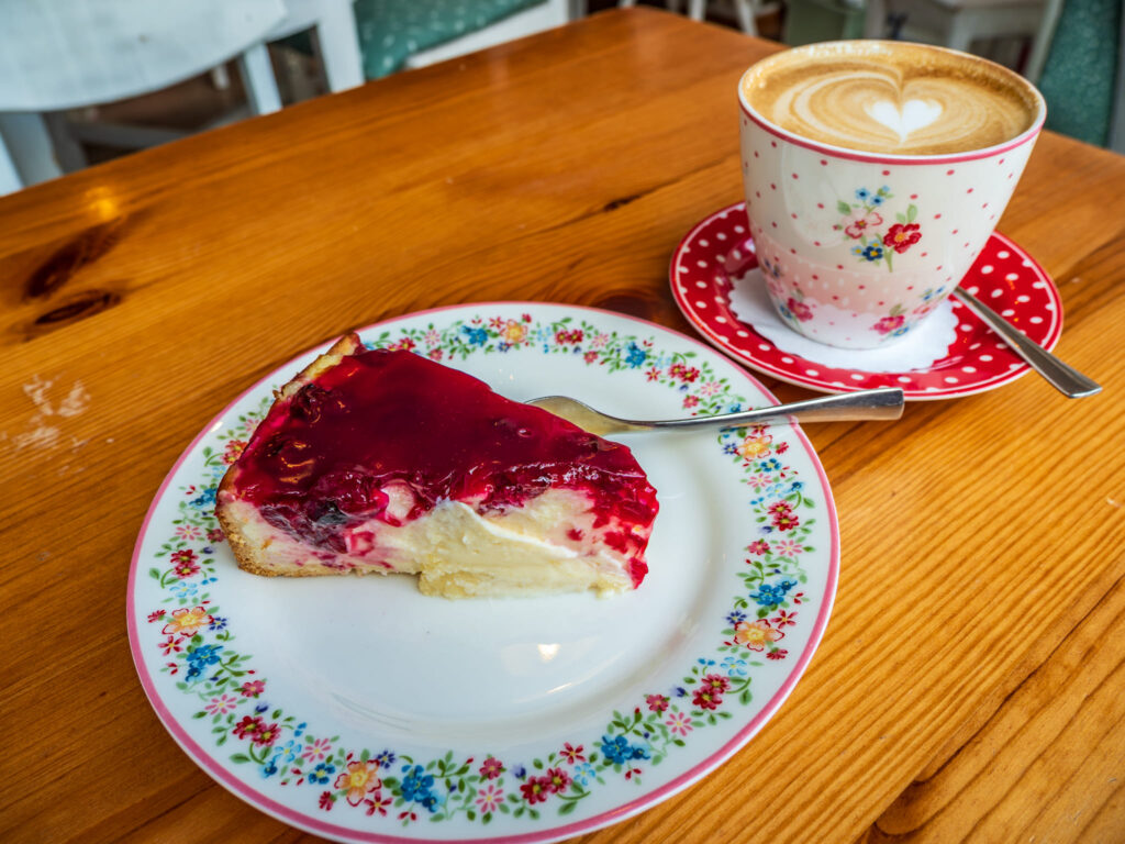 Ein wenig wie bei Oma In der kuscheligen Wohnzimmeratmosphäre schmecken die selbstgebackenen Kuchen und Torten wie von der lieben Oma. Ich entschied mich für den leckeren und nicht zu süßen Schmandkuchen mit Fruchtspiegel und eine Tasse Cappucino. Auch der Café schmeckt sehr gut, die Bohnen werden von der Rösterei Ottimo aus Gotha geliefert. Hier kann man sich den ganzen Tag über verwöhnen lassen, am Vormittag werden Frühstücksvariationen und nach 12 Uhr kleine Gerichte wie Gemüse- Quiche oder Paninis angeboten.