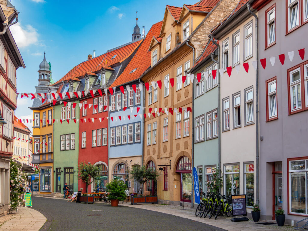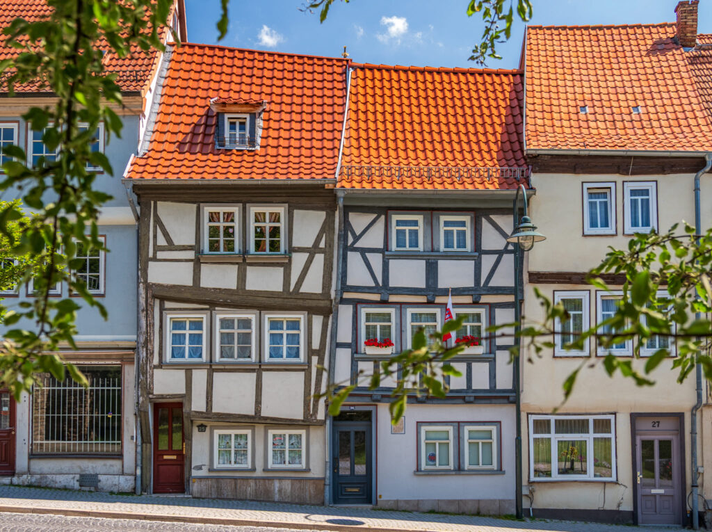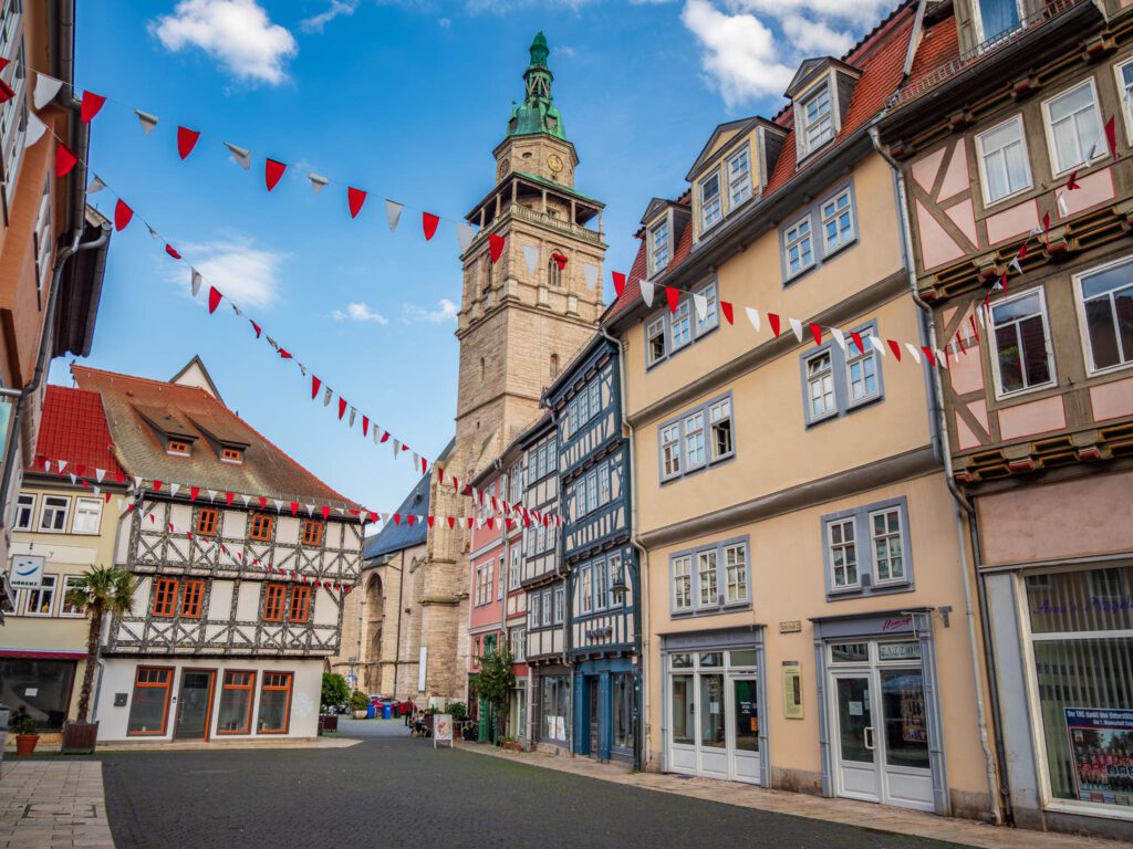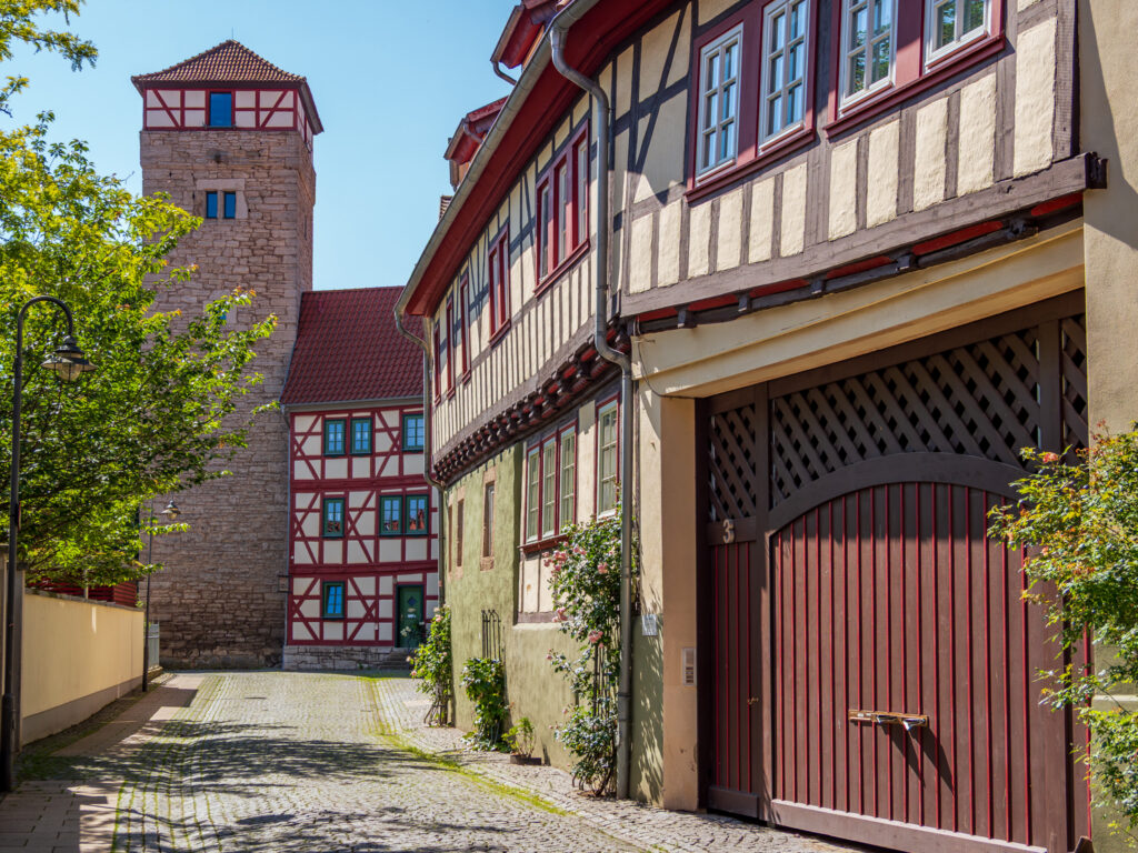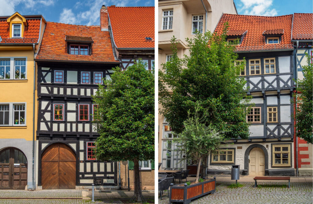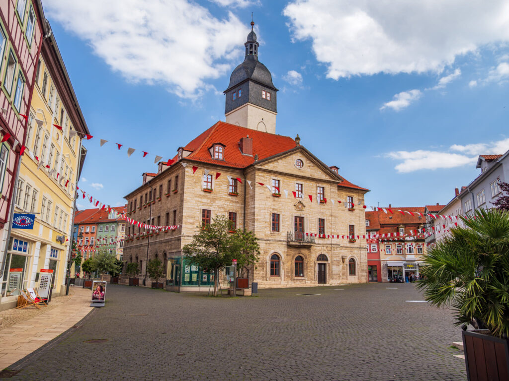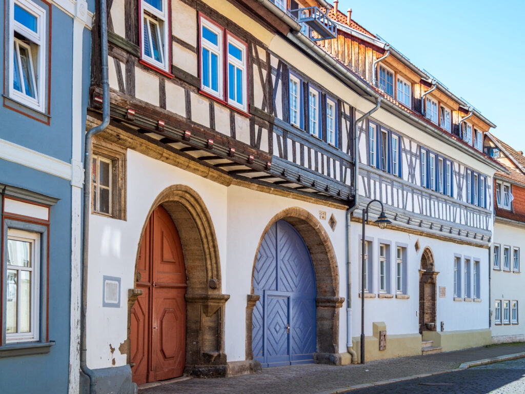 Augen auf beim Stadtspaziergang! Die thüringische Fachwerkbaukunst wurde von verschiedenen Baustilen aus ganz Deutschland beeinflußt. So gibt es zahlreiche bekannte Fachwerkschmuckformen wie u.a. die Fächerrosette, Taubänder, Schiffskehlen und „Wilde Männer“ zu entdecken. Man findet jedoch auch eine regionale Besonderheit an zahlreichen Häusern der Altstadt. Die sogenannte „Thüringer Leiter“ ist eine rustikale Fachwerkkonstruktion, die der Anordnung nach an eine querliegende Leiter erinnert und dem Fachwerkbau zusätzliche Stütze liefert. Vielleicht entdeckst du eine?