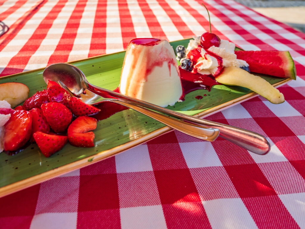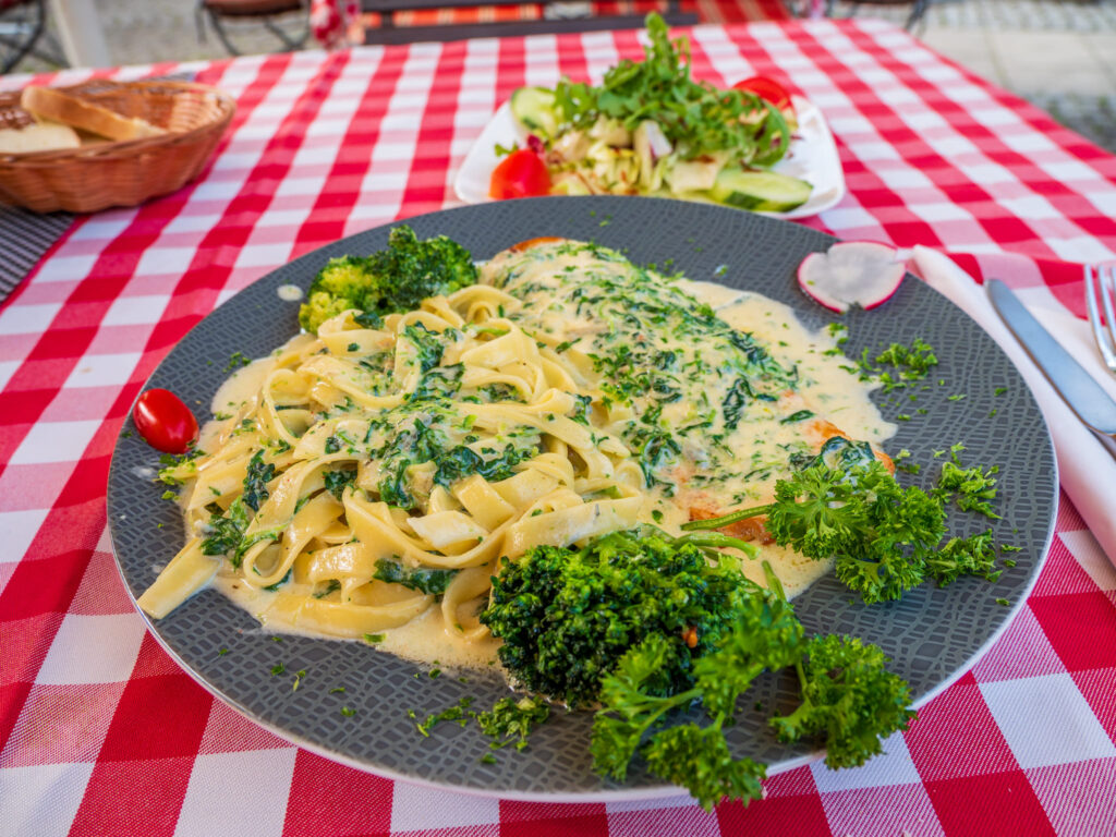 Cucina deliziosa Am Schlösschenpark wird man mit italienischer Küche und feinem Eis in der „Villa Italia“ so richtig verwöhnt. Das Restaurant ist in einem über 250 Jahre altem Kavaliershäuschen des Friederikenschlösschens untergebracht und bietet in den warmen Monaten auch zahlreiche Sitzmöglichkeiten im Außenbereich mit Blick in den malerischen Park an. Auf der Karte findet man beliebte italienische Klassiker wie Pastavariationen, Pizzen oder Fisch- und Fleischgerichte. Ich entschied mich für die sehr feine „Petto di Tacchino al Gorgonzola“, das ist eine gegrillte Putenbrust mit Spinat-Gorgonzola Sauce, Brokkoli und Tagliatelle. Als leichtes Dessert passte die klassische „Panne Cotta“ mit frischen Früchten an dem warmen Sommerabend ganz wunderbar.
