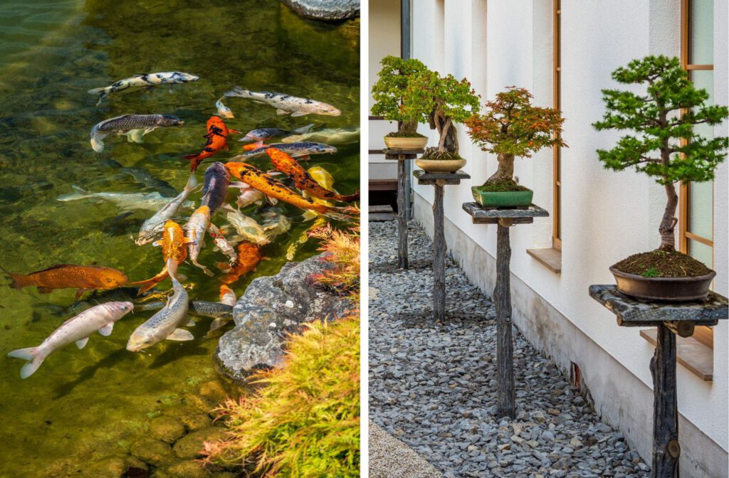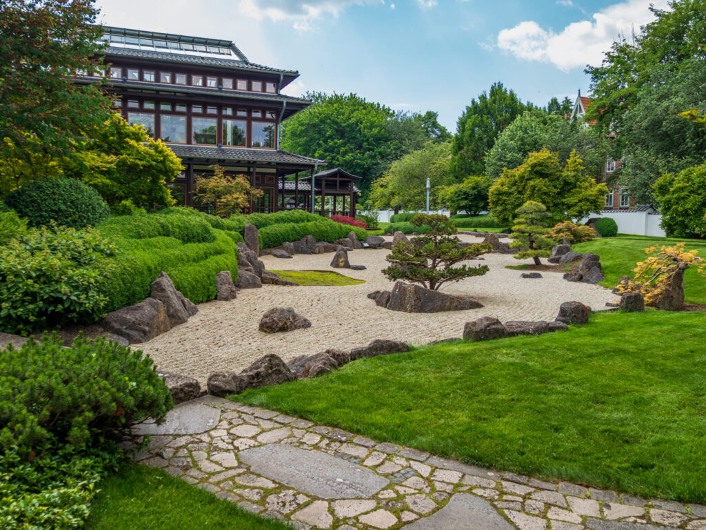 Ästhetik pur Japanische Gärten sind bis ins kleinste Detail durchdacht und geplant. Bei der Gartengestaltung werden Landschaften in den Jahreszeiten in Miniatur imitiert. Koi Karpfen symbolisieren Kraft und Wohlstand, Bonsai Bäume stehen für Geduld und die Harmonie zwischen Mensch und Natur. Fließende Wellenbewegungen durchziehen die Gartenlandschaft. Die geschwungenen Linien der Kiesflächen spiegeln die Strukturen der Gewässer wieder und entstehen in Meditation mit einem Rechen. Läuft man auf dem Zickzack-Steg über die Teichlandschaft, läßt man der japanischen Mythologie nach die bösen Geister hinter sich. Im Teepavillon kann man ab 13 Uhr japanischen Tee trinken und an bestimmten Terminen an Teezeremonien teilnehmen, diese Termine bitte rechtzeitig erfragen.