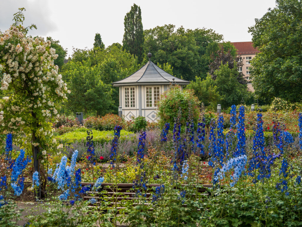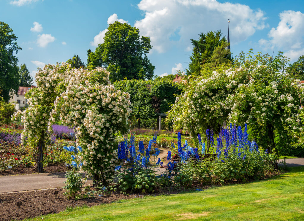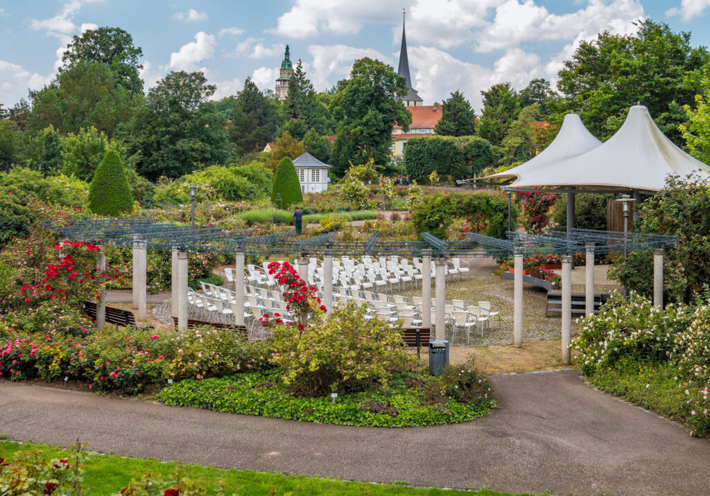 Rosenliebe Über 450 Rosenarten- und sorten, Gräser und Stauden sind auf dem 18.000 qm großen ehemaligen Fabrikgelände ausgestellt. 90 davon sind Züchtungen aus Bad Langensalza. Rosenliebhaber freuen sich über historische und englische Rosen, Wildrosen und Edelrosen in Beeten, an Pergolen und Rosenbögen. Sie verströmen sanften Blumenduft und zeigen die ganze Faszination der Rosenliebe. Die Blütezeit ist von Juni bis Oktober, dann verwandelt sich der idyllische Garten in ein buntes Blütenmeer mitten in der Altstadt.