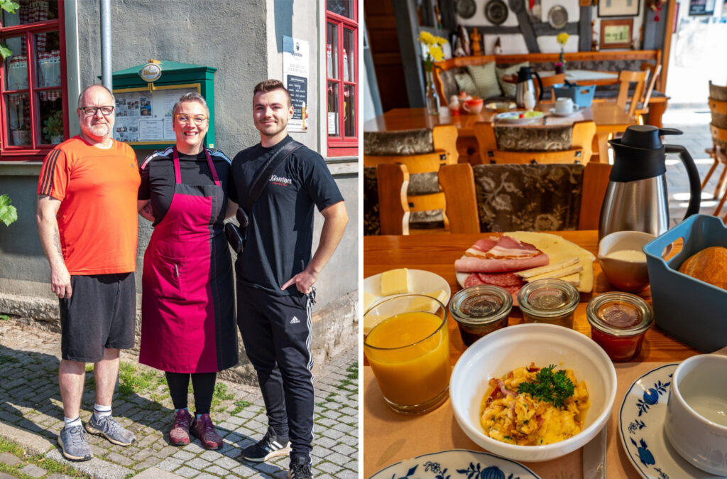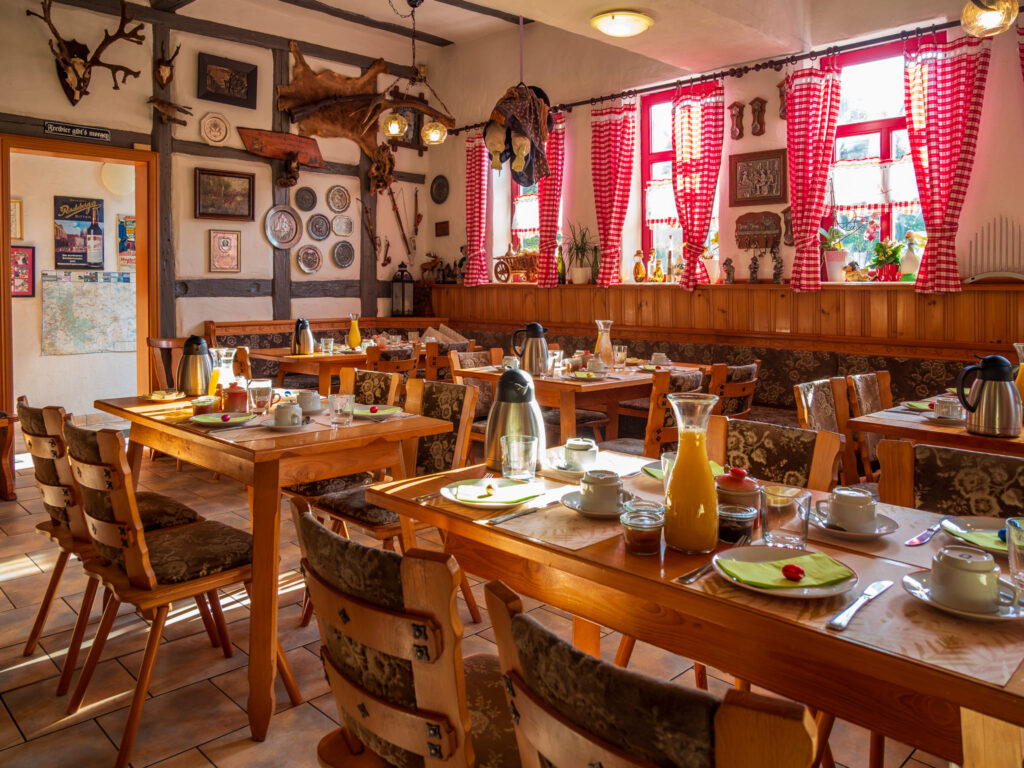 Bodenständige Heimatküche Das Herz der Weintraube ist ein 600 Jahre altes Fachwerkhaus. In dem ehemaligen Ausspannehaus sind die gemütliche Gaststube, Küche und Fremdenzimmer untergebracht, das Gasthaus kann also auf eine lange Tradition zurückblicken. Alexandra und Maik Dollhofer sind herzliche Gastgeber und verwöhnen ihre Gäste mit bodenständiger, thüringischer Heimatküche zu fairen Preisen. Die Speisekarte bietet Klassiker wie Eisbein, Bratwürste, Sülze, Wild oder Krautwickel, alles frisch und vom Chef selbst gekocht. Morgens wartet am Tisch bereits ein individuell auf den Gast zusammengestelltes Frühstück. Die Marmelade ist von der lieben Omi selbstgemacht und das frisch zubereitete Rührei mit Speck schmeckt sehr lecker, hier wird man schon am frühen Morgen mit einem sättigenden Frühstück so richtig umsorgt.