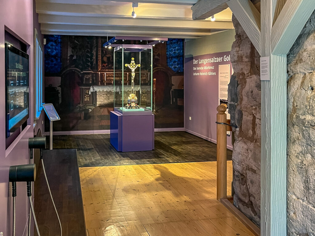Hunderte Edelsteine Das Schmuckstück der Ausstellung ist der „Langensalzaer Goldjunge“. Das mit Edelsteinen und Diamanten besetzte barocke Altarkreuz von Johann Heinrich Köhler funkelt prunkvoll und ist für jeden Liebhaber sakraler Kunst ein richtiges Highlight.