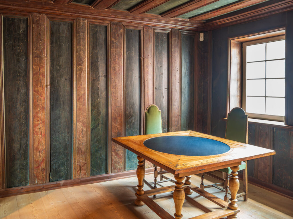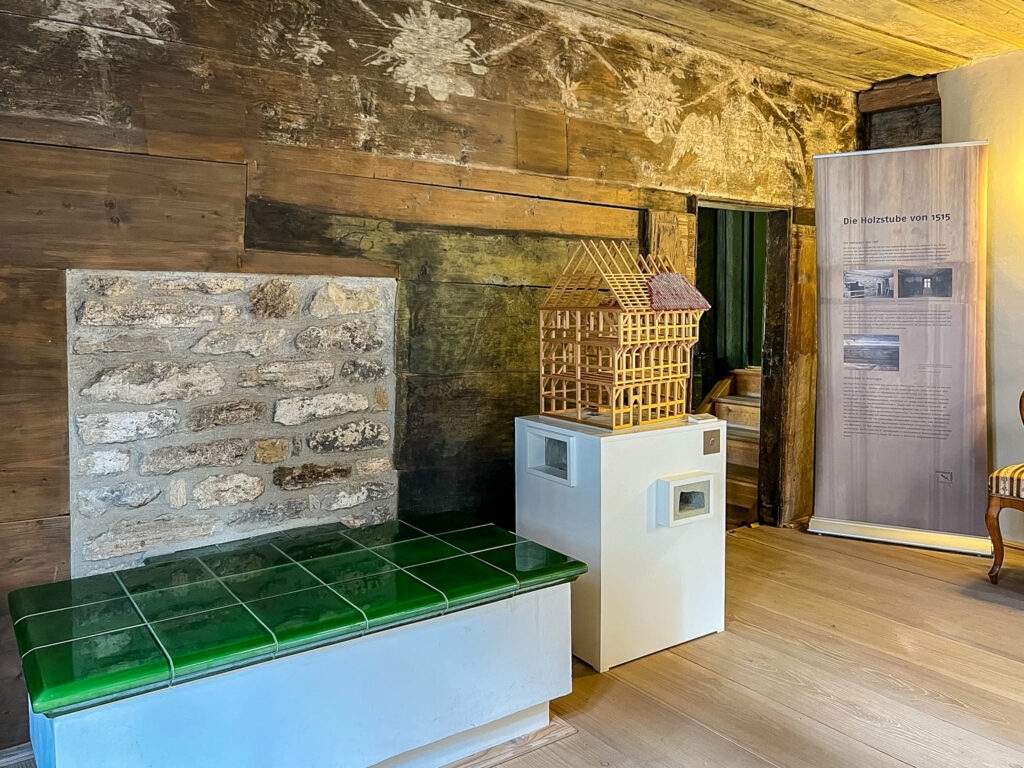 Perfekte Wärmedämmung Die eingebaute Holzbohlenstube katapultiert dich direkt ins 16. Jahrhundert. Ursprünglich befand sie sich in einem Wohnhaus in der Salzstraße. Eine Holzbohlenstube war oft der einzige beheizte Raum im Haus. Sie wurde meistens in eine Hausecke als ein eigenständiges und selbsttragendes Gehäuse eingebaut, galt als guter Wärmespeicher und regulierte schwankende Luftfeuchtigkeit. Mit prachtvollen Schnitzereien und Malereien geschmückt galt sie als die „gute Stube“.