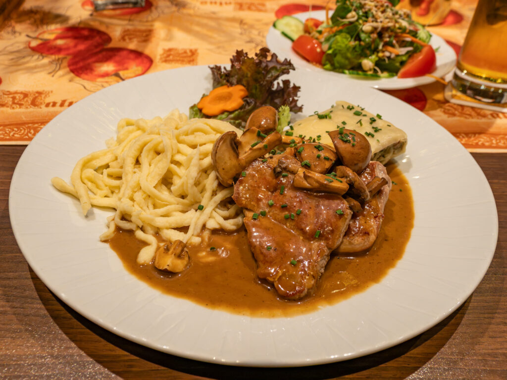Handgeschabt schmeckt`s am besten Gute regionale, schwäbische Küche zu fairen Preisen in zentraler Lage und mit herzlichem Service on top bietet das Restaurant „Die Traube“ von Anita und Jochen Demel. Wer gutbürgerliche Küche liebt, ist hier genau richtig. Die Traditionsgaststätte ist im „Schmeck den Süden“ Gourmetführer der Gastronomen Baden Württembergs gelistet. Das Netzwerk bestätigt höchste Qualität und Regionalität auf dem Teller. Ich wählte den sehr leckeren Spezialitätenteller „Uracher Leibgericht“, das sind Schweinemedallions mit Steinchampignons in einem Rahmsößle, dazu handgeschabte Spätzle vom Brett und einer Maultasche. Auf der Karte finden sich viele schwäbische Klassiker wie Metzelsuppe, Alblinsen mit Spätzle und Saitenwürstle, Käsespätzle, geschmortes Häxle vom Alblamm und der beliebte Klassiker Zwiebelrostbraten. Da das Restaurant bei Einheimischen und Gästen sehr beliebt ist, empfehle ich unbedingt einen Tisch rechtzeitig zu reservieren.