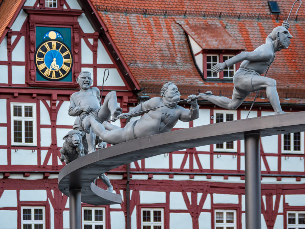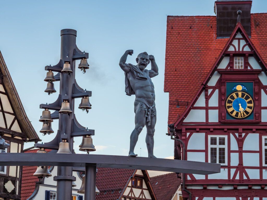 Mit vollem Körpereinsatz In Siegerpose posiert nicht etwa Herkules im Zentrum des Marktplatzes, sondern es prahlt der Gewinner des Bad Uracher Schäferlaufs auf der Schäferlauf – Skulptur des Bildhauers Peter Lenk, dessen satirischen Skulpturen des Öfteren für Kontroversen sorgen und auf gesellschaftliche Missstände hinweisen. Die Skulptur wurde 2023 zum 300-jährigen Jubiläum eingeweiht und zeigt lebensgroße Schäfer im Wettlauf um den Sieg. Im Zentrum steht ein Glockenspiel, das fünfmal täglich erklingt.