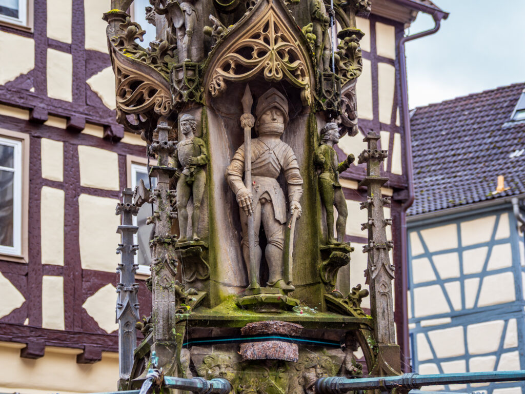 Spätgotisches Meisterwerk Auf dem sogenannten „Kleinen Markt“ steht gegenüber des Rathauses der Marktbrunnen. Er sieht alt aus, ist aber in seiner heutigen Form eine Kopie von 1904. Es war wieder Graf Eberhard im Bart, der ihn 1495 seiner Heimatstadt nach der Ernennung zum Herzog schenkte. Er diente der Bevölkerung als zentraler Laufbrunnen, sollte aber auch mit dem heiligen Christopherus als Brunnenheiligen Reisende schützen, denn Urach lag an einer wichtigen Fernstraße. Reichverziert mit Figuren die Ritter, Kriegsknechte und Propheten darstellen, ist er ein wunderbares Beispiel spätgotischer Brunnenarchitektur.