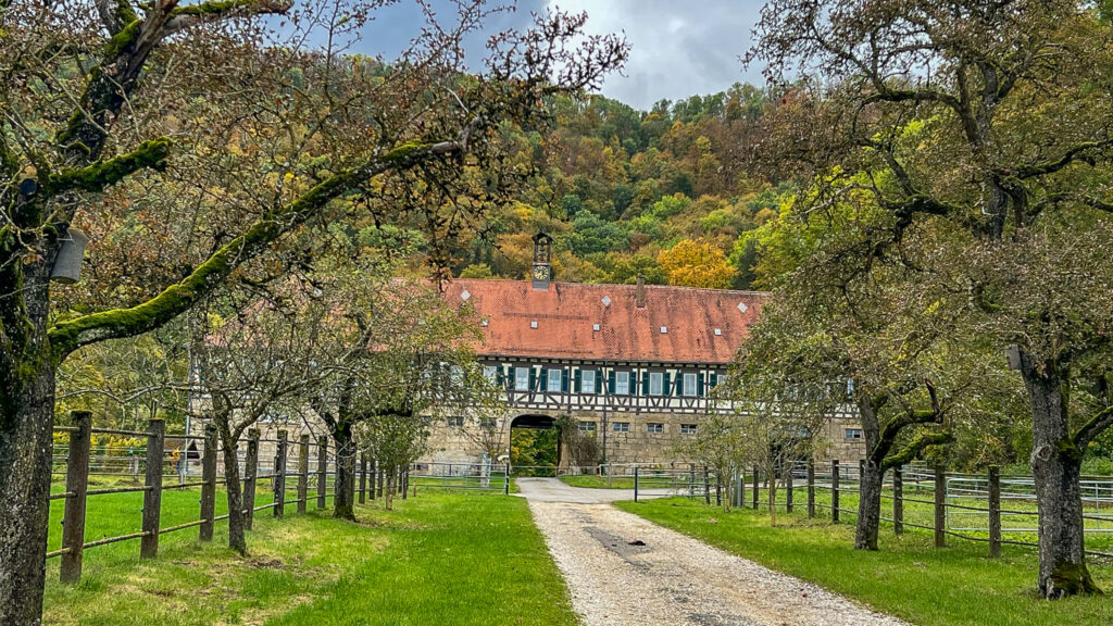 Auf dem Weg zum Gütersteiner Wasserfall kommt man am Fachwerk-Gestütshof Güterstein vorbei, der heute ein Vorwerk des Haupt- und Landesgestüts Marbach ist und im hinteren Teil des idyllischen Maisental liegt. Hier sind Hengstfohlen und Wallache untergebracht und im Sommer Pensionsrinder. Güterstein hat eine lange Geschichte, bereits 1254 ist ein Zisterzienserkloster Güterstein urkundlich belegt. Gegründet wurde es vom Zisterzienserabt, Kardinalbischof und Kardinallegat in Frankreich und Deutschland Graf Konrad von Urach, als zweitgeborener schlug er eine geistliche Laufbahn ein. Güterstein gehörte später zum Benediktinerkloster Zweifalten und wurde im 15. Jahrhundert in eine Kartause umgewandelt. Von der geistlichen Zeit Gütersteins ist heute leider nichts mehr erhalten. 1820 gründete König Wilhelm I. von Württemberg anstelle des ehemaligen Klosterhofes den bis heute erhaltenen Gestütshof.